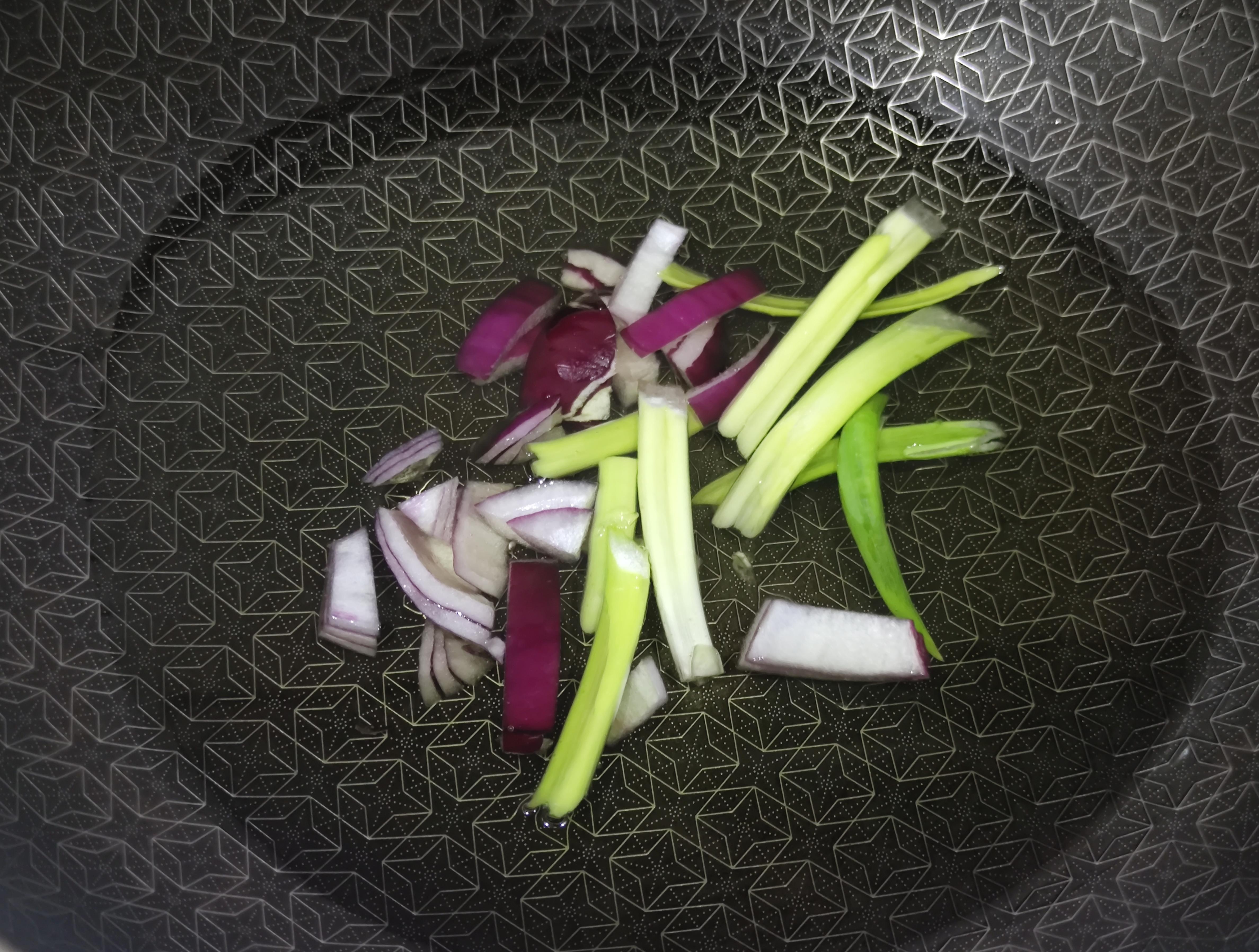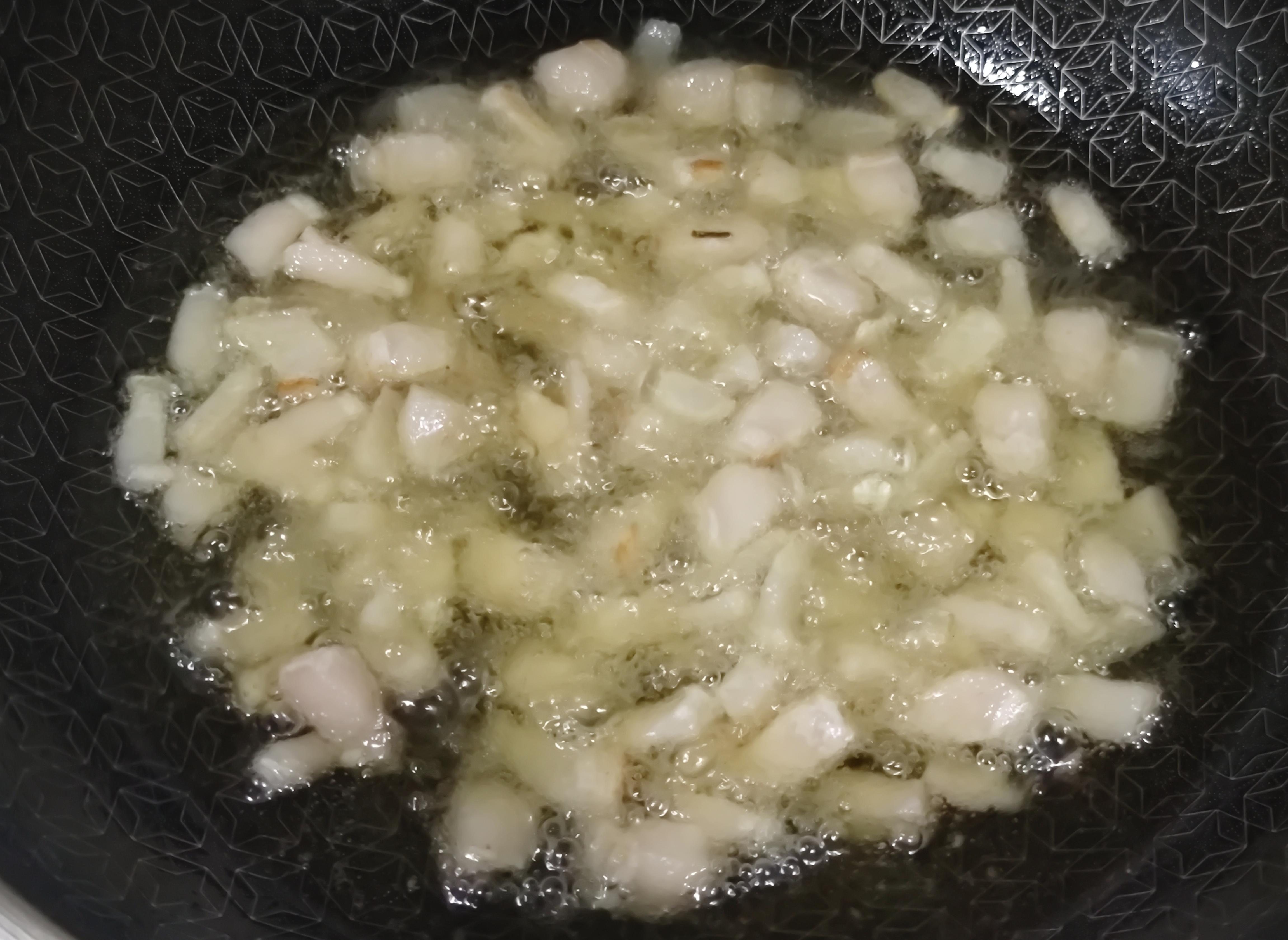 同样炒至微微泛黄,油面冒密集的泡。