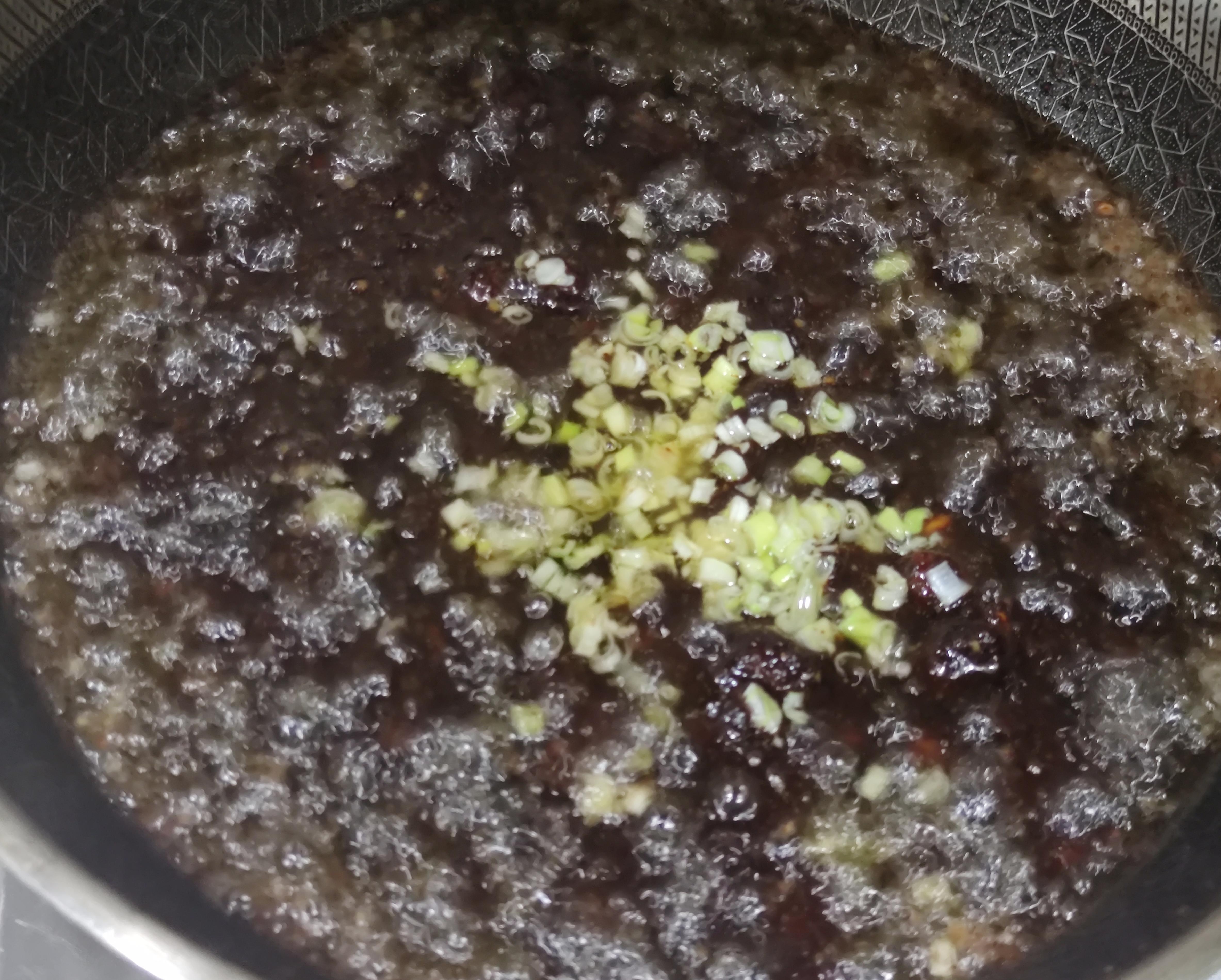 炒至大约20分钟,这时候酱里的水分基本蒸发的差不多了,油和酱产生了明显的分离。这时候下入姜末和葱花,在炒至10分钟左右。