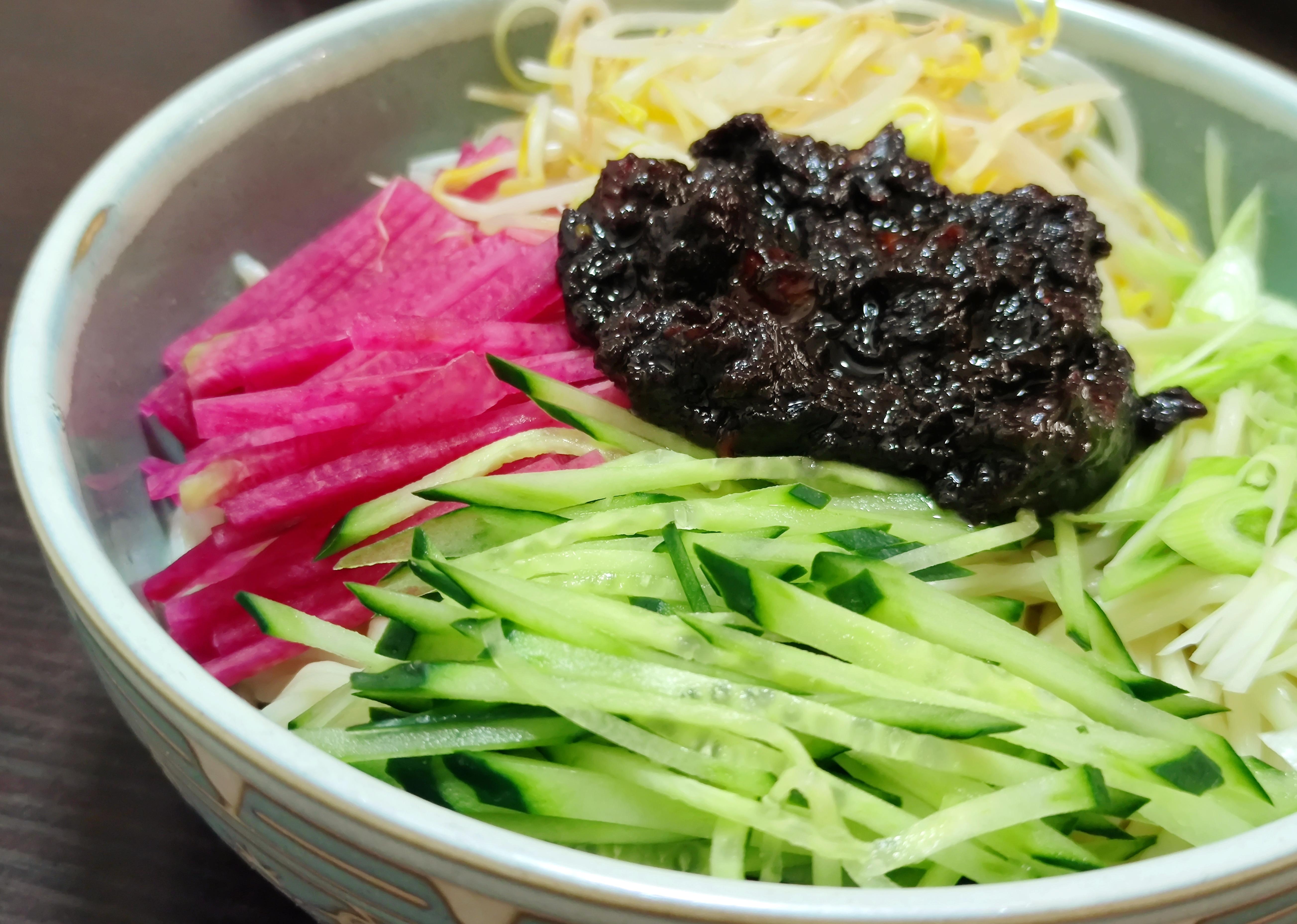 酱炒好后准备好菜码,我这里准备了心里美、蒜苗、黄豆芽、黄瓜丝,刚好凑一个双数的菜码。