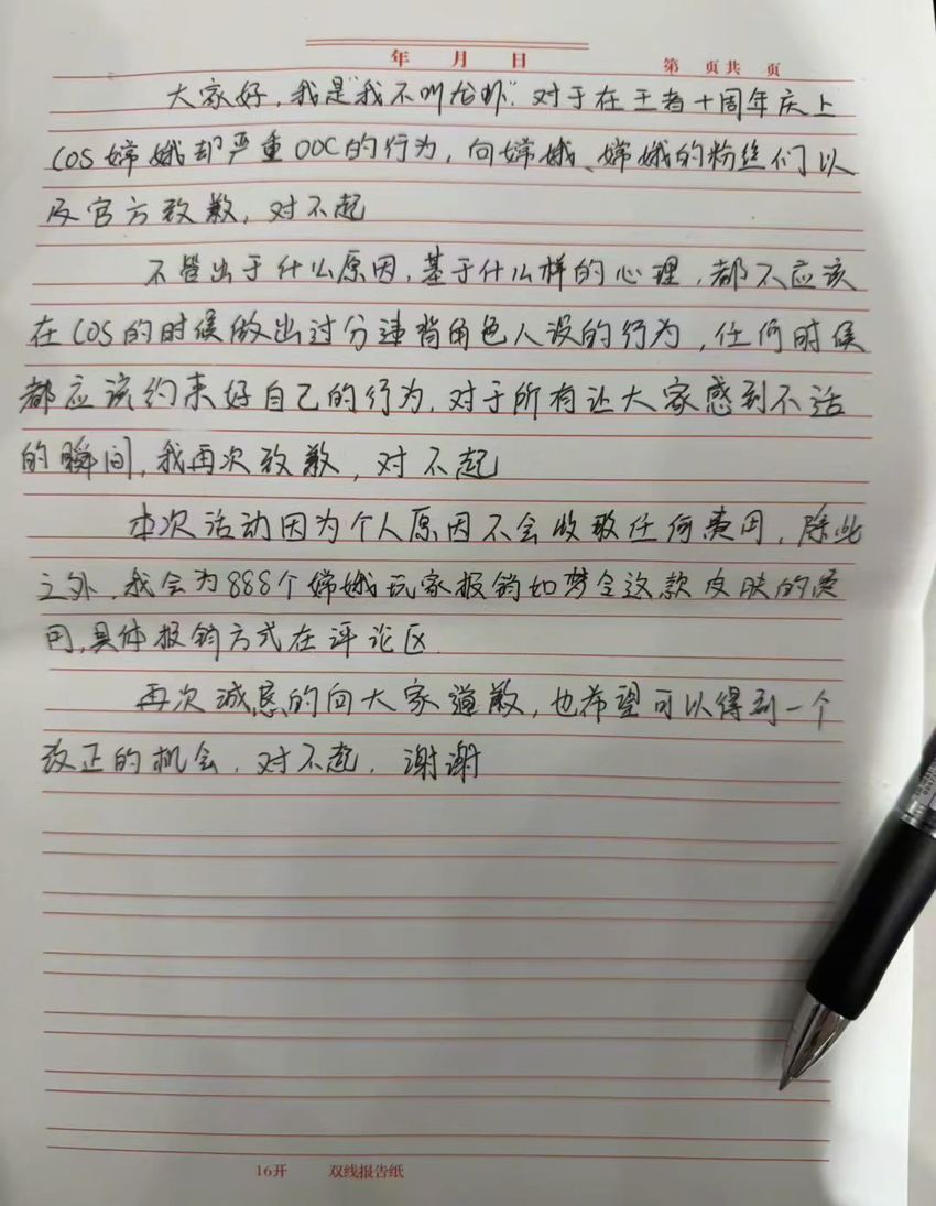 大家好,我是我不叫龙虾。对于在王者十周年庆上cos嫦娥且严重ooc的行为,向嫦娥、嫦娥的粉丝们以及官方致歉,对不起。