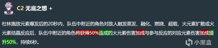命之座二:队伍中附近的角色将获得50%火元素伤害加成与参与反应的对应元素伤害加成,持续6秒。→元素结晶反应后,队伍中附近的角色造成的火元素伤害与参与反应的对应元素伤害提升50%,持续6秒。