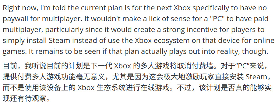 伴随次世代Xbox的最显著变革可能是取消Xbox Live在线服务付费墙,实现免费多人联机。科登称:"目前获悉的计划是次世代Xbox将免除多人游戏付费门槛",因为此类限制"对'PC'设备毫无意义"。杰兹·科登说道