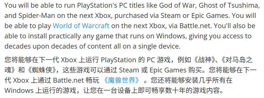 尽管基于PC架构,科登指出新Xbox仍将保持主机使用感。"初始化体验与现行主机类似",用户可选择完全停留在Xbox生态内。同时,其开放性允许用户运行原PC独占作品,包括PlayStation移植作《战神》《对马岛之魂》以及《魔兽世界》等战网游戏。