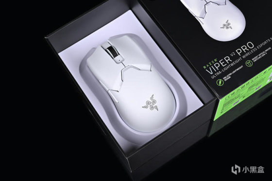 打开具有阻尼感的包装上盖,被模具塑胶壳包裹的白色雷蛇毒蝰 V2 专业版内藏其中。