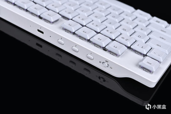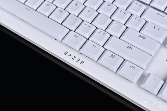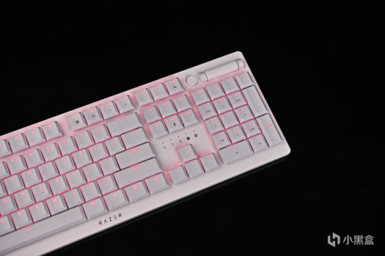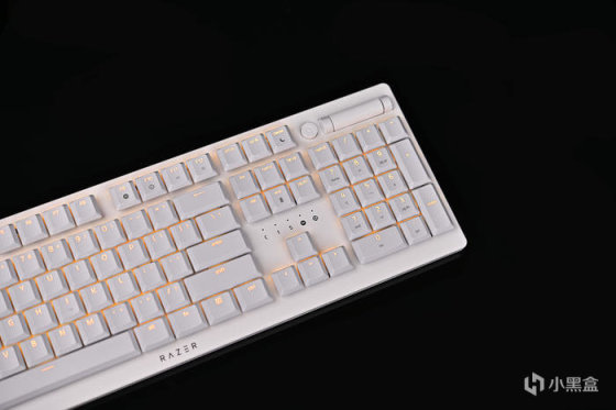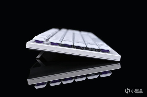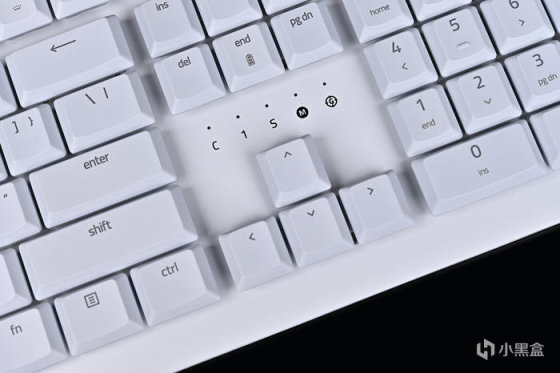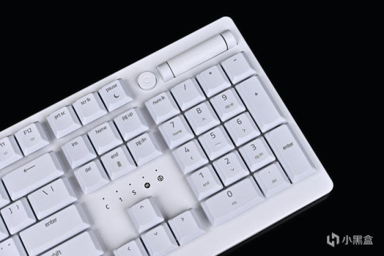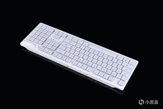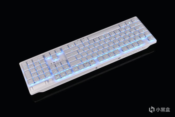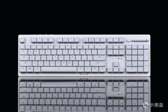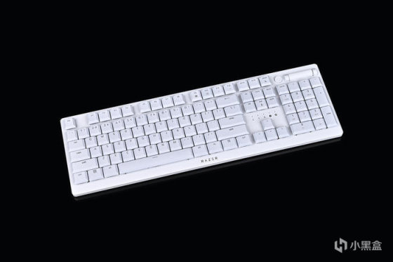 通体采用白色设计,为标准的 104 配列,搭配了多媒体滚轮以及多媒体按键一颗。上盖顶板为铝合金顶板,保持了轻量化以及阳极氧化给到的金属质感。同时经过了耐刮擦以及防腐蚀方面的测试,能支持长时间的重度使用。键帽采用 ABS 材质,添加了耐用涂层和激光蚀刻,字体更清晰,更耐磨和抗打油。