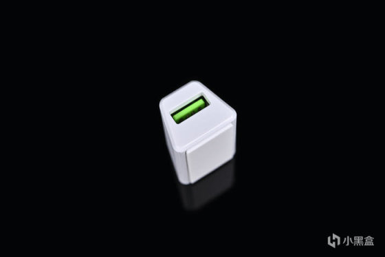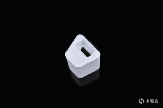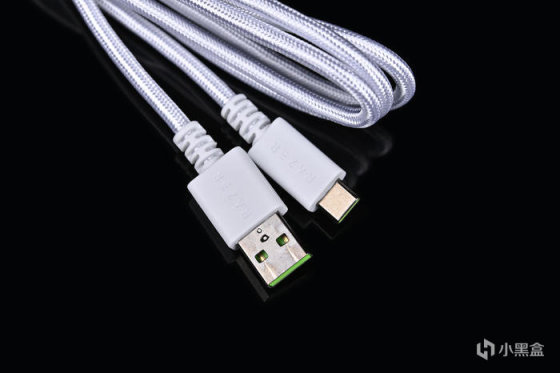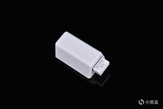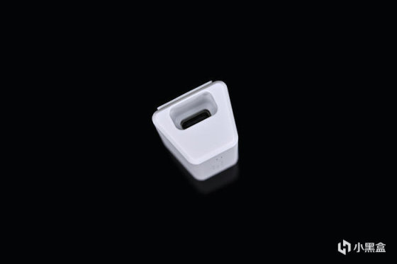 附赠一个白色无线接收器转接器,接上线材可以让接收器距离键盘更近,传输信号更好避免干扰,顶部阴刻 RAZER Logo,底部带有防滑橡胶。一侧为 USB Type-A 接口,内芯采用鲜艳的绿色设计。