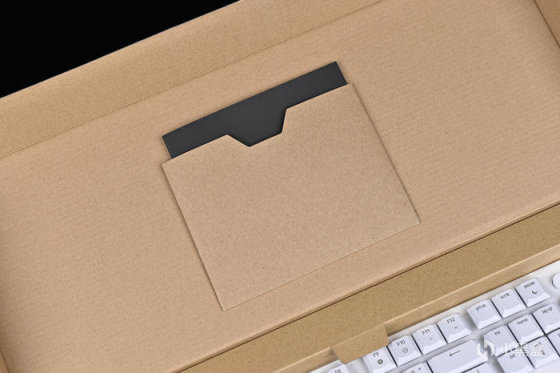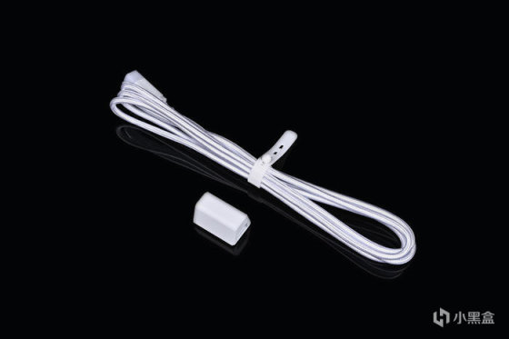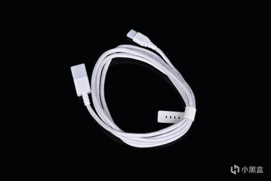 附带一根 1.8 米白色超轻伞绳连接线和转接器,负责键盘充电或者有线连接使用,具有专门的的理线带方便收纳,线材非常轻巧柔软,就算使用有线连接也基本没有阻碍感知。