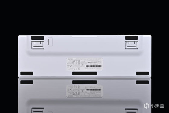 键盘背面白色设计,ABS 塑料材质,标配五个防滑脚贴,放在桌上不容易打滑。