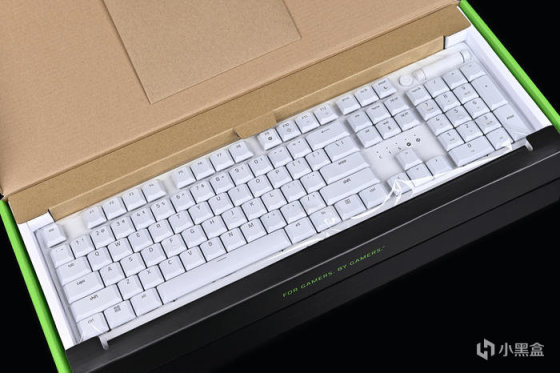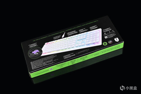 外包装延续了雷蛇经典的黑绿设计,中央是键盘的渲染图,左下角是键盘英文名称,右上角是雷蛇的 Logo,支持雷蛇自家的 Razer Chroma RGB。