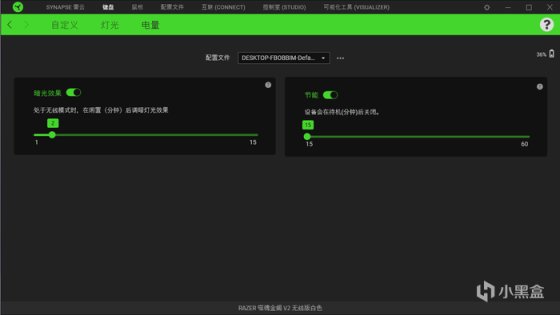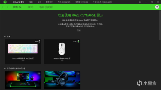 进入 RAZER SYNAPSE 雷云软件主界面,,可以看到雷蛇噬魂金蝎 V2 Pro+毒蝰 V2Pro 的图标,右上角显示了当前电量状态。