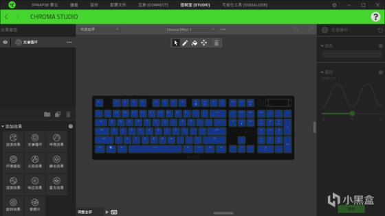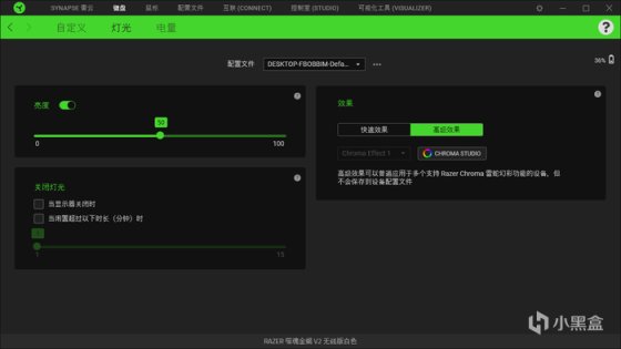 灯光界面可以对键盘灯效亮度、效果进行微调,效果预设共 11 个选项可选,还可使用 Chroma 雷蛇幻彩功能进行设备同步。