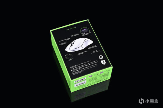 雷蛇毒蝰 V2 Pro 专业版外包装延续了雷蛇经典的黑绿撞色设计,包装盒正面黑色底色,中央是鼠标本体渲染图,左上角是 HyperSpeed 无线连接技术标识,右上角是 Razer 的 Logo,下方则是产品型号以及特色功能介绍。