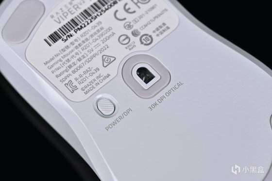 鼠标底部包括铭牌贴纸在内采用了白色同色处理,底部标配三块特氟龙材质脚贴,使用起来非常顺滑顺滑灵动的操纵表现。中间圆圈位置为 FOCUS Pro 30K 传感器光头,原生最高 30000DPI,支持 750IPS 以及 70G 加速度,以及 99.8% 的精准度。借助移动同步功能,Razer™ Focus Pro 光学传感器可将鼠标信号与电脑提取信息的时间间隔进行精准同步,获得及时的最新鼠标位置信息,从而实现更一致的追踪。优化了对玻璃垫等特殊材质鼠标垫的兼容性,同时也配备了智能追踪、非对称中止技术,无论游戏还是日常使用都更加精准高效,指哪打哪。