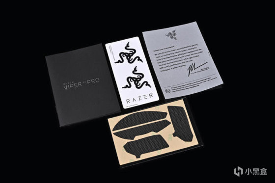 附件方面,感谢信一封、说明书一本、防滑贴一套以及经典的雷蛇 Logo 贴纸一张。
