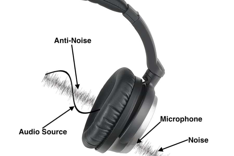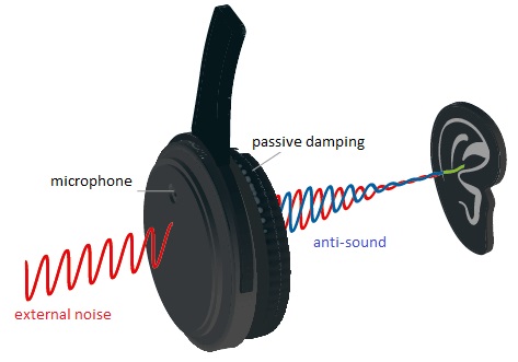 耳机上有一个或多个麦克风实时监听外界噪声,然后耳机芯片会生成反相声波(Anti-noise),与噪音相遇后,两者相互抵消(物理上称为“相消干涉”),这样传到你耳朵里的噪音就大大减弱了。