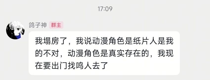 对此鸽子神回应道:“我塌房了,我说动漫角色是纸片人是我的不对,动漫角色是真实存在的,我现在要出门找鸣人去了!”