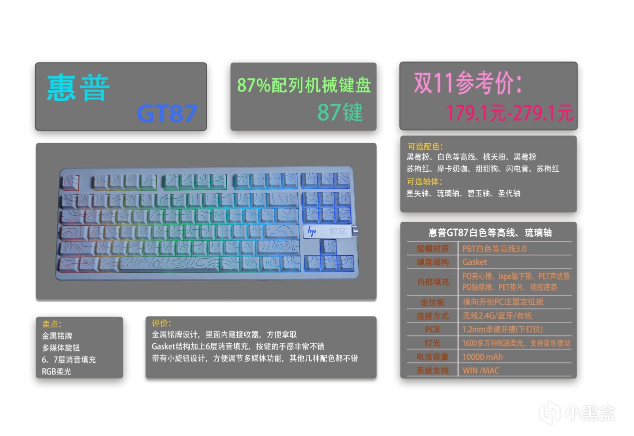 惠普GT87是一款带有旋钮设计、87配列的三模机械键盘,这款是白色等高线、琉璃轴版本,价格为210元。