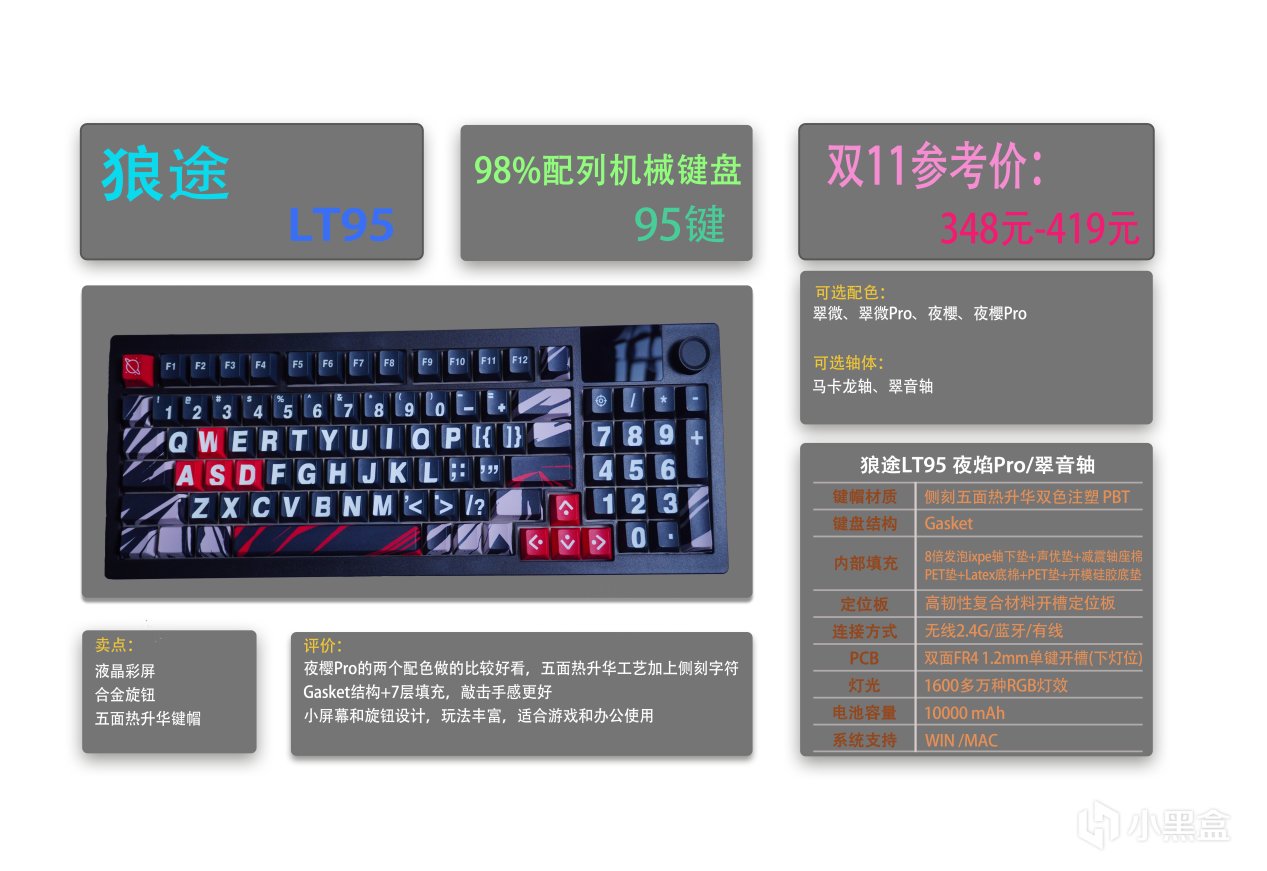 黑爵狼途LT95是一款带有小屏幕+旋钮设计、98配列的三模机械键盘,这款是夜焰Pro、翠音轴版本,价格为419元。