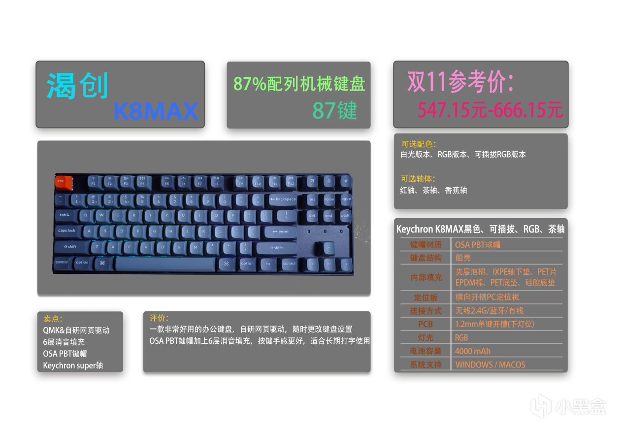 Keychron K8MAX是一款87配列的三模机械键盘,这款是版本黑色、可插拔、RGB、茶轴版本,价格为666.15元。