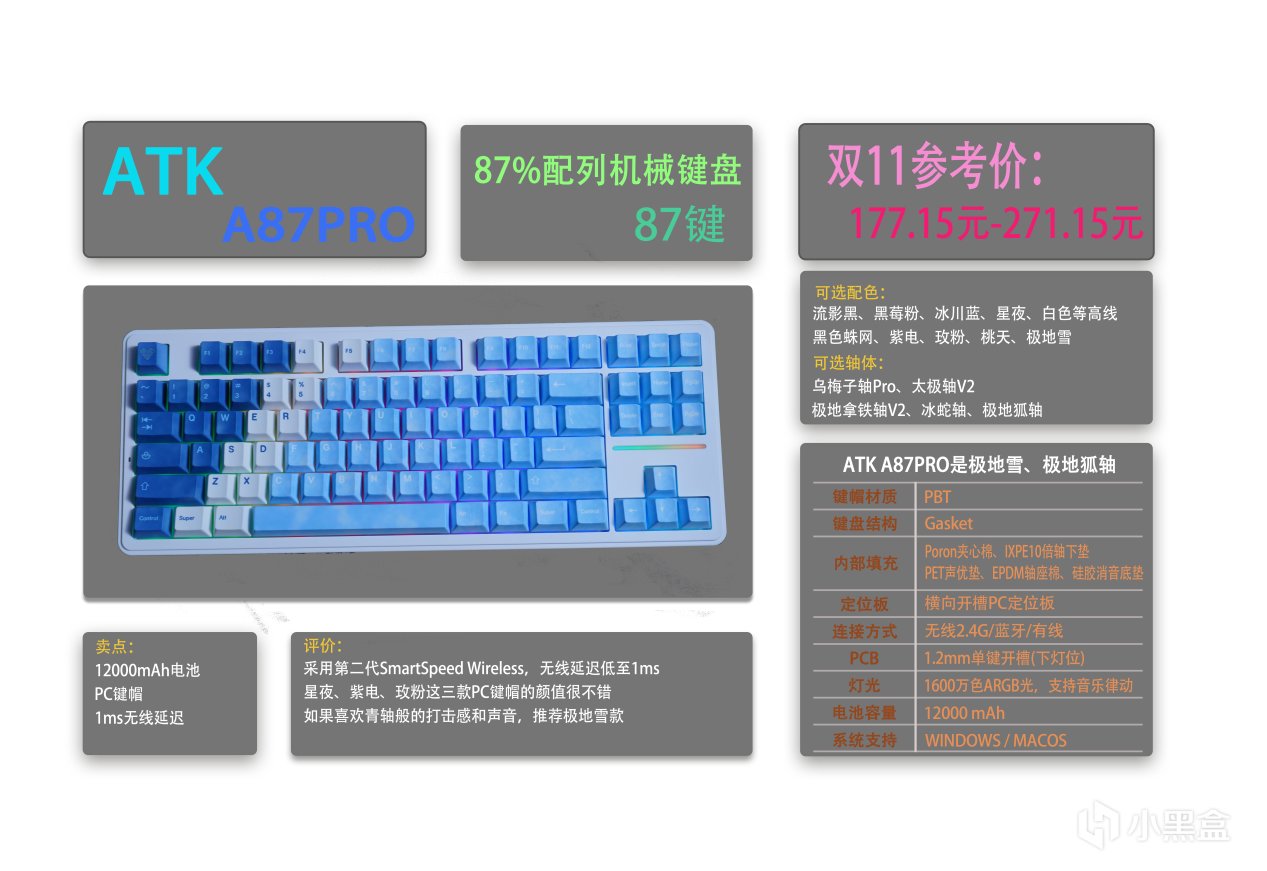 ATK A87PRO是一款87配列的三模机械键盘,这款是极地雪、极地狐轴版本,价格为271.15元。