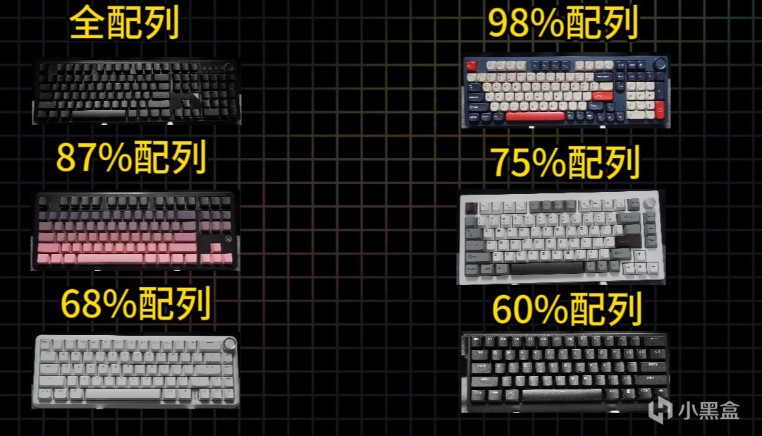 我们的用途主要区分为办公和游戏场景,办公键盘推荐全配列、98%配列、87%配列,因为保留了重量的按键区域。游戏键盘其实覆盖整个配列,不过最常见的还是87%配列和75%配列,68%配列和60%配列在磁轴方面比较多。