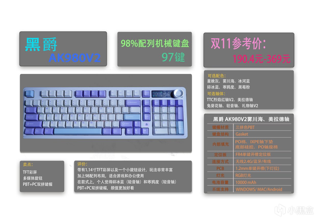 黑爵 ak980V2是一款带有小屏幕+旋钮设计、98配列的三模机械键盘,这款是雾川海、美拉德轴版本,价格为275.4元。
