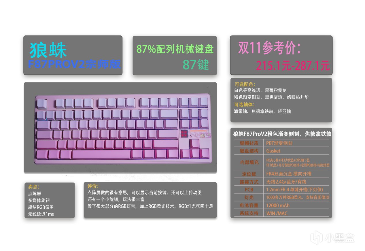 狼蛛F87ProV2是一款87配列的三模机械键盘,这款是粉色渐变侧刻、焦糖拿铁轴版本,价格为233.1元。
