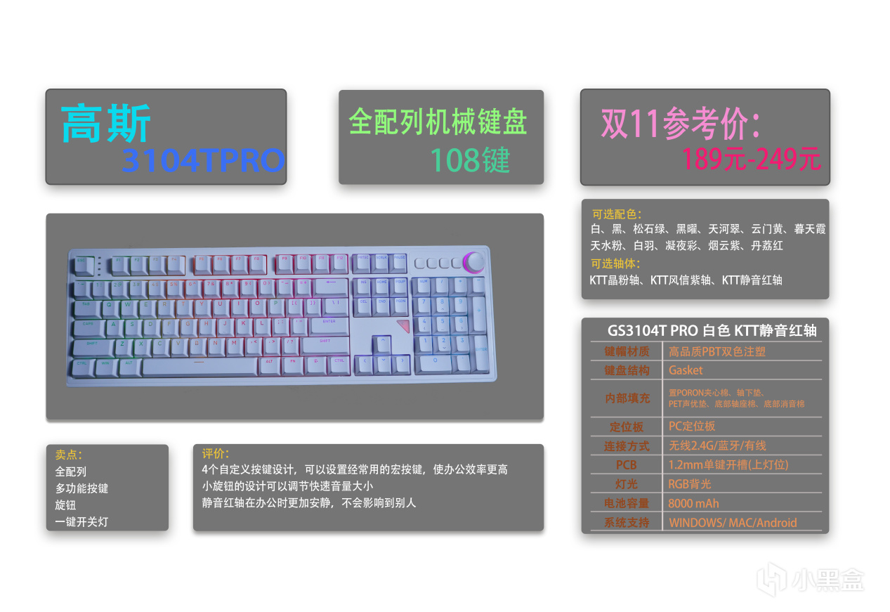 GANSS高斯3104TPRO是一款带旋钮设计、全配列的三模机械键盘,这款是GS3104T PRO 白色 KTT静音红轴版本,价格为215.1元。