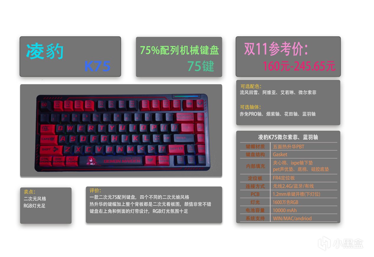 凌豹K75是一款75配列的三模机械键盘,这款是微尔索菲、蓝羽轴版本,价格为245.65元。