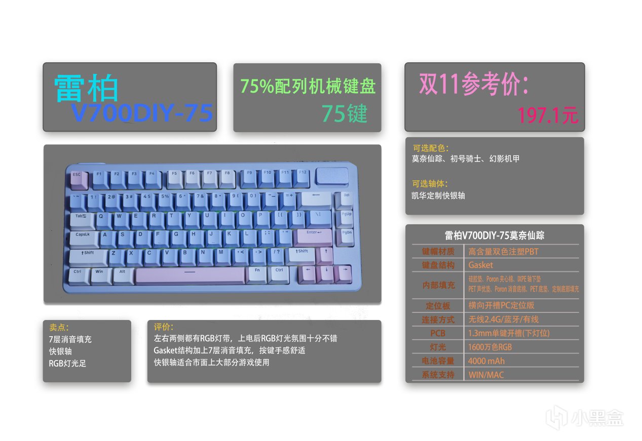 雷柏V700DIY-75是一款75配列的三模机械键盘,这款是莫奈仙踪版本,价格为197.1元。