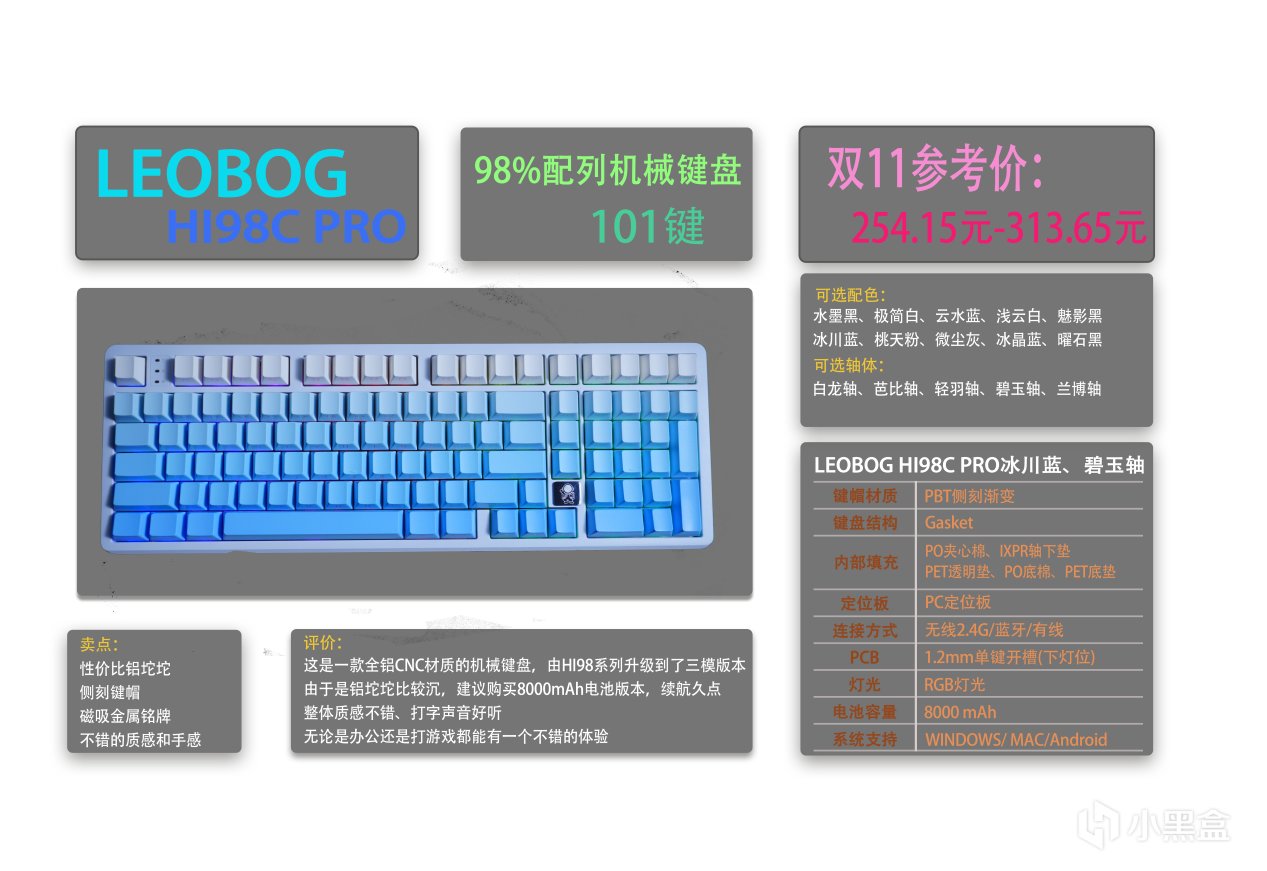 LEOBOG Hi98C Pro是一款铝坨坨、98配列的三模机械键盘,这款是冰川蓝、碧玉轴版本,价格为306.85元。