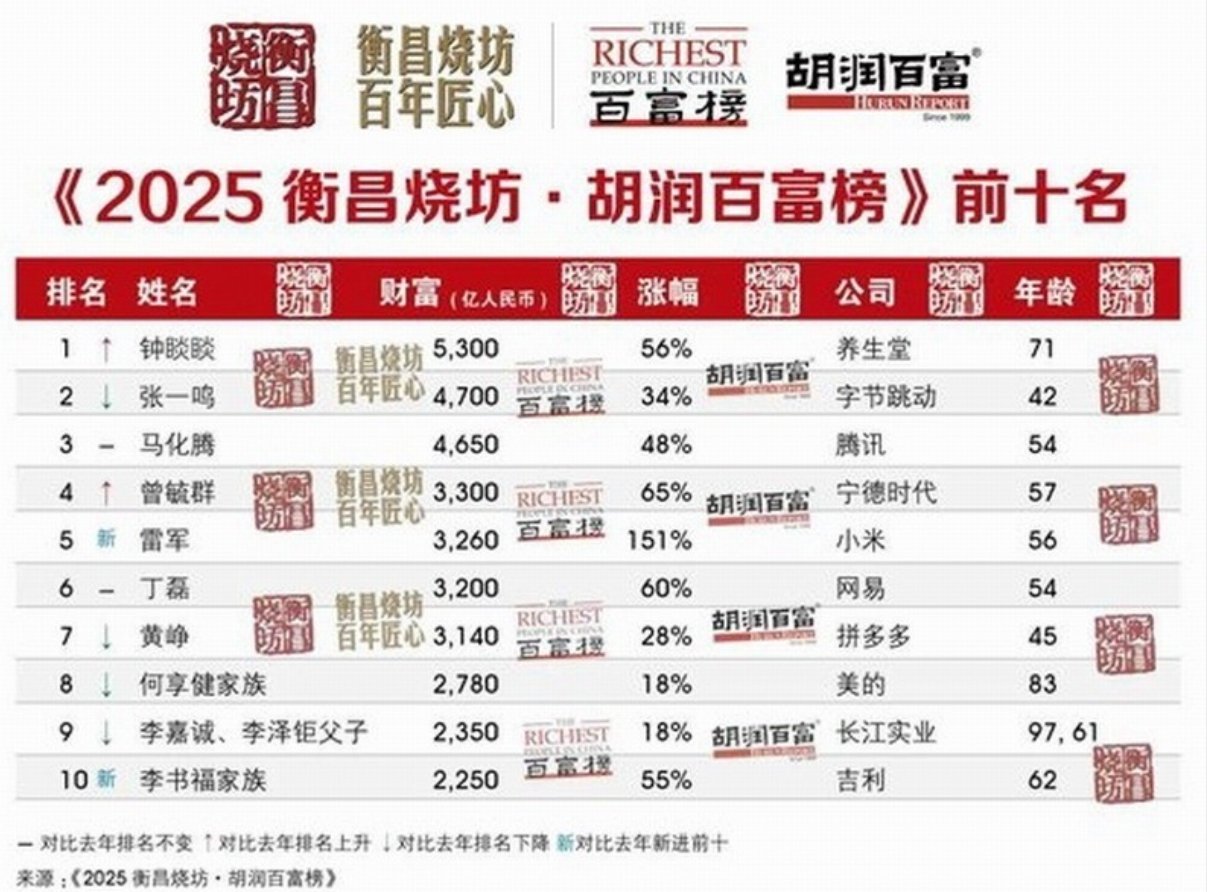 雷军财富的快速增长主要得益于小米汽车业务的爆发式增长和手机高端化策略的成功。今年上半年,小米汽车交付量达15.72万辆,居汽车新势力前五,收入213亿元。榜单显示,71岁的农夫山泉创始人钟睒睒以5300亿元第四次成为中国首富。此次胡润百富榜共有1434位个人财富50亿元以上的企业家上榜,比去年增加31%。