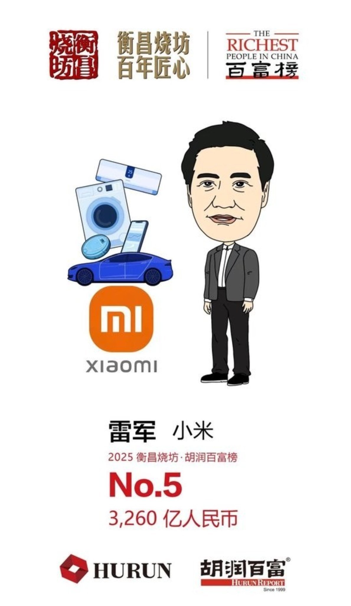 胡润表示,当消费电子与汽车行业深度融合的机器人时代来临,雷军将成为中国首富的有力竞争者。
