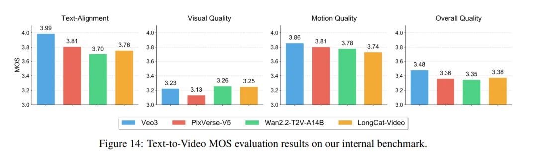 在内部测试中,LongCat-Video的文生视频表现略优于PixVerse-V5、Wan2.2-T2V,但不如谷歌的Veo3;