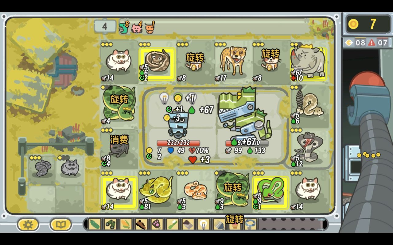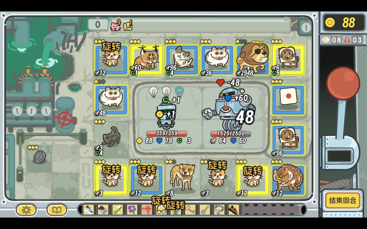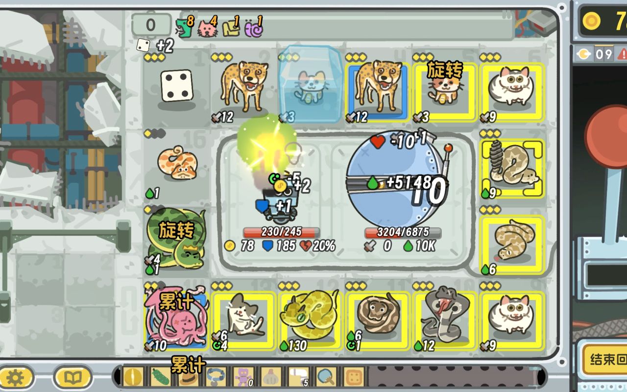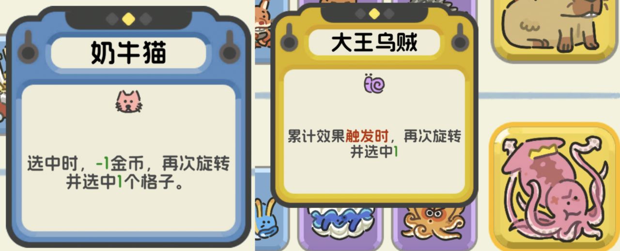 再加上奶牛猫和大王乌贼的效果,这个组合在拉杆以后选中的格子非常非常多。同理,旋转的次数也会随即增加。