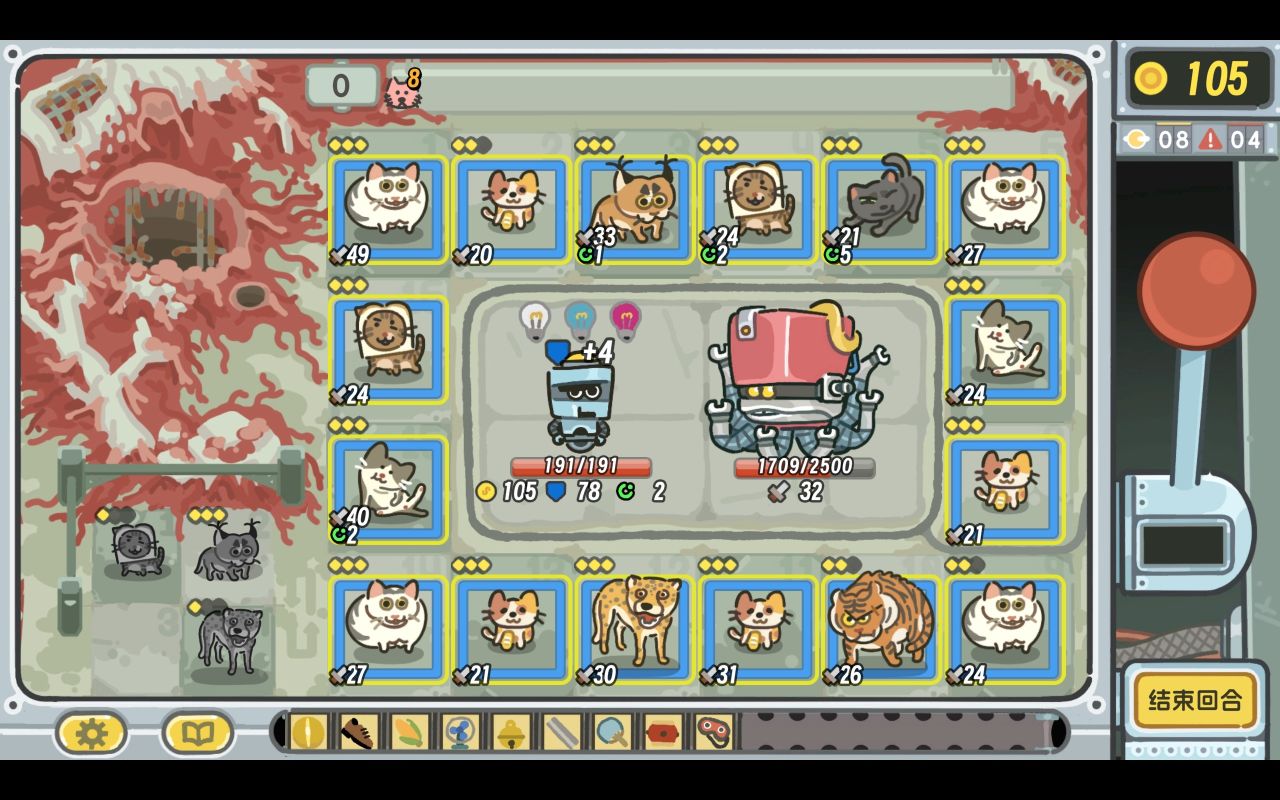 大致的牌由八蛇,四猫(奶牛猫和招财猫以及豹豹,前期尽量上招财拿经济,中后期尽可能多上奶牛猫)以及大王乌贼组成。