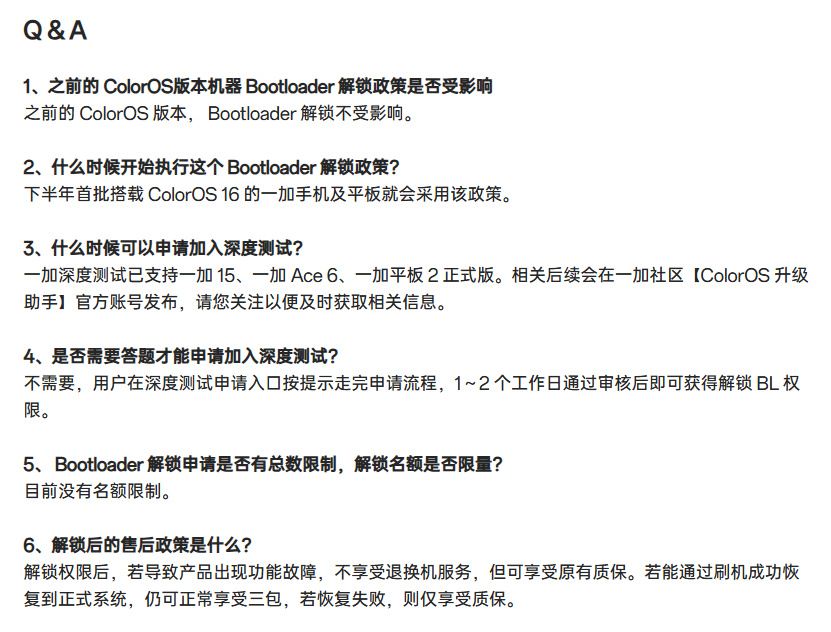 一加深度测试公告更新(2025年10月28号更新),将于ColorOS16版本上调整Bootloader解锁方式。开发者及特定需求用户在充分知悉解锁和刷机存在的风险并可承担该风险的情况下,可通过官方通道申请加入深度测试计划。