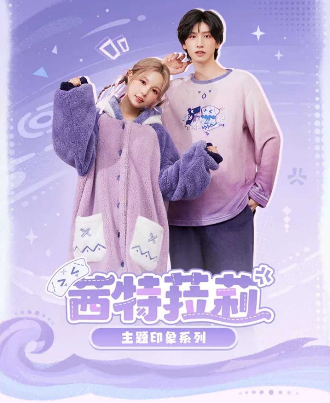茜特菈莉系列以紫色为主色调该系列包含绒绒家居套装、绒绒家居拖鞋、家居睡袍(含眼罩) 三类商品。特菈莉系列以紫色为主色调