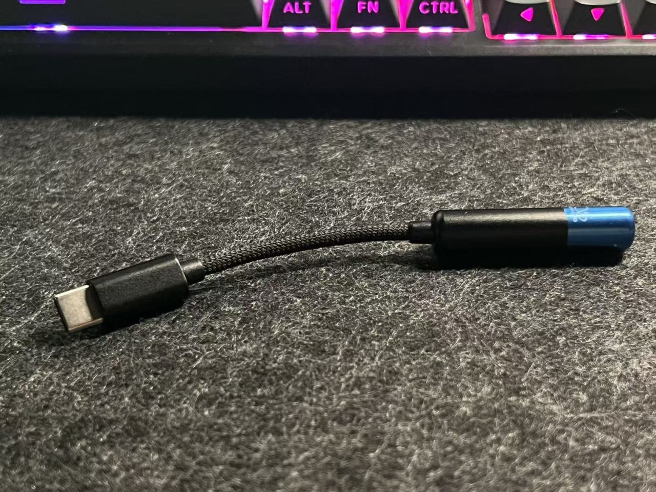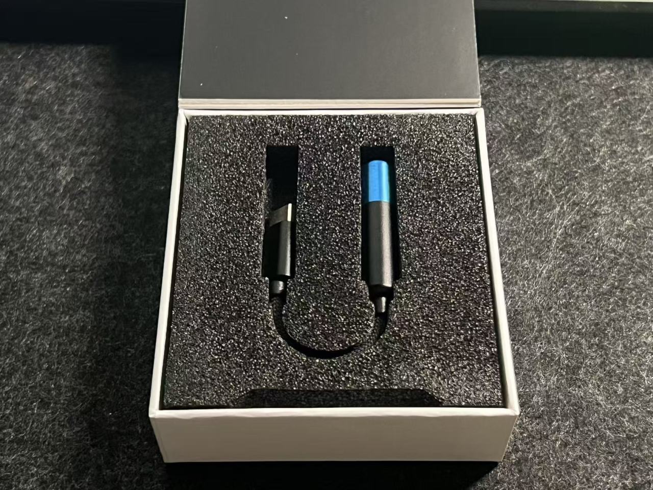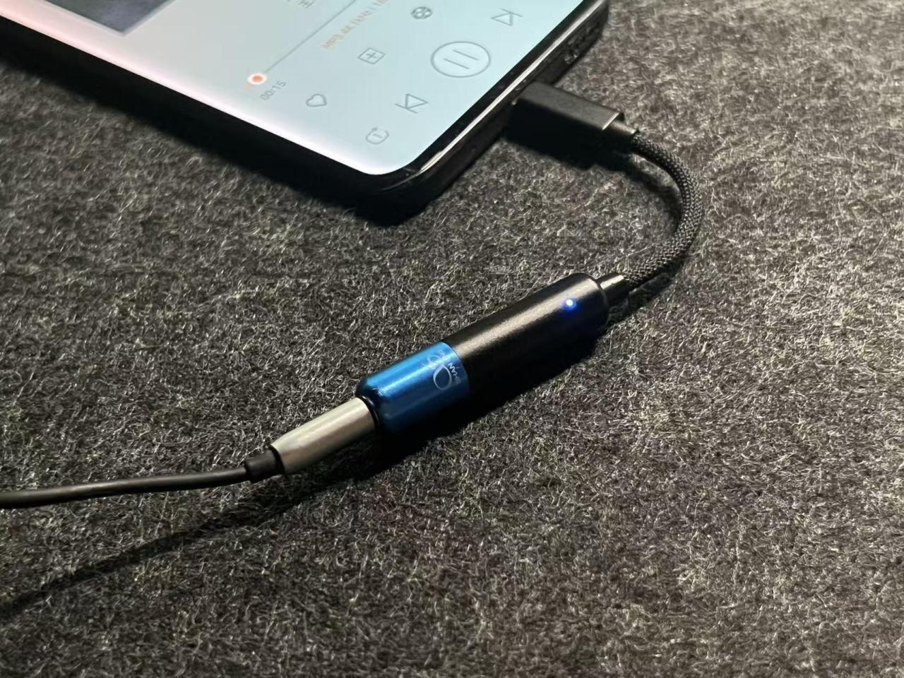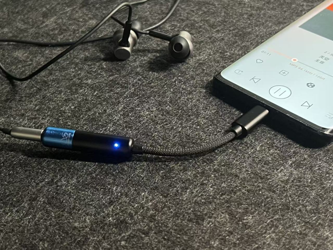 朋友买的这个是蓝黑配色,全金属外壳做工质感真没话说,3.5mm输出端还有LED指示灯(不同颜色代表不同采样率),线材是高纯度的OFC镀银线,整个重量在8.4g,日常出门往口袋里一塞就完事了。
