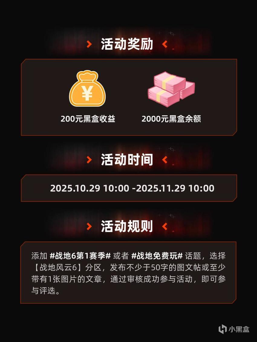 余额奖励:所有携带#战地6第1赛季#话题符合活动要求的作者均可参与,将有2000元黑盒余额奖金供玩家瓜分。(注:每个小黑盒账号最多入选5篇有效参与内容,超出数量内容无权参与瓜分)
