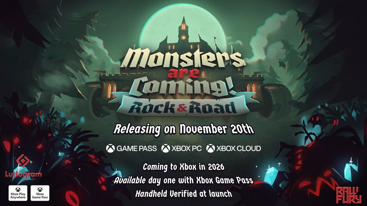 怪物已近在咫尺。在Raw Fury 旗下《怪物来袭!摇滚与公路》(Monsters Are Coming! Rock & Road)中,你将在这个濒临崩塌的世界里建造防御、奋勇战斗,抵御一波波穷追不舍的怪物潮。积蓄力量,制定策略,在混乱来临时携手坚守。这场怪物入侵将于 11 月 20 日正式开启,届时你可通过 Xbox Game Pass 首日畅玩,游戏将登陆、Xbox PC 平台、Xbox 云游戏,将于2026年登录Xbox Series X|S平台、同时支持 Xbox Play Anywhere 跨平台功能 —— 保持警惕,做好准备,并记住: