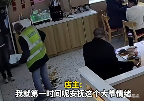 餐馆老板听到声音马上跑了过来,一边让服务员赶紧清理地上的饭菜,一边安慰大爷说:“没事没事,你先找个位置坐下,等做好了我给你端过去。” 很快,服务员就把现场收拾干净了,厨房也重新给大爷做了一份饭菜。
