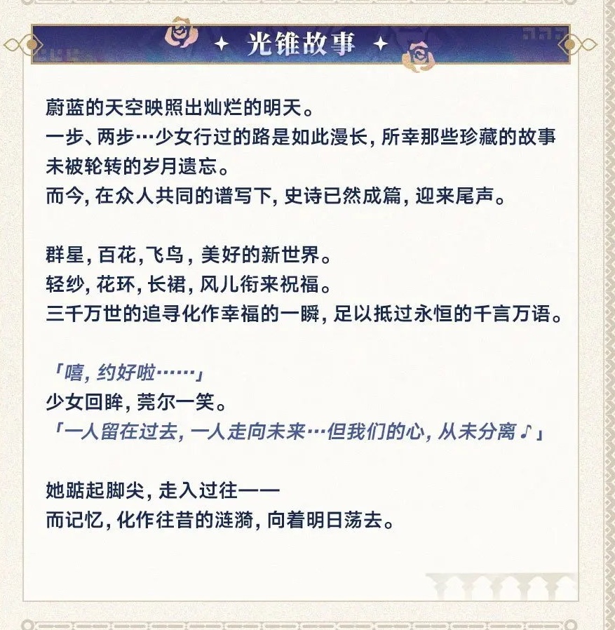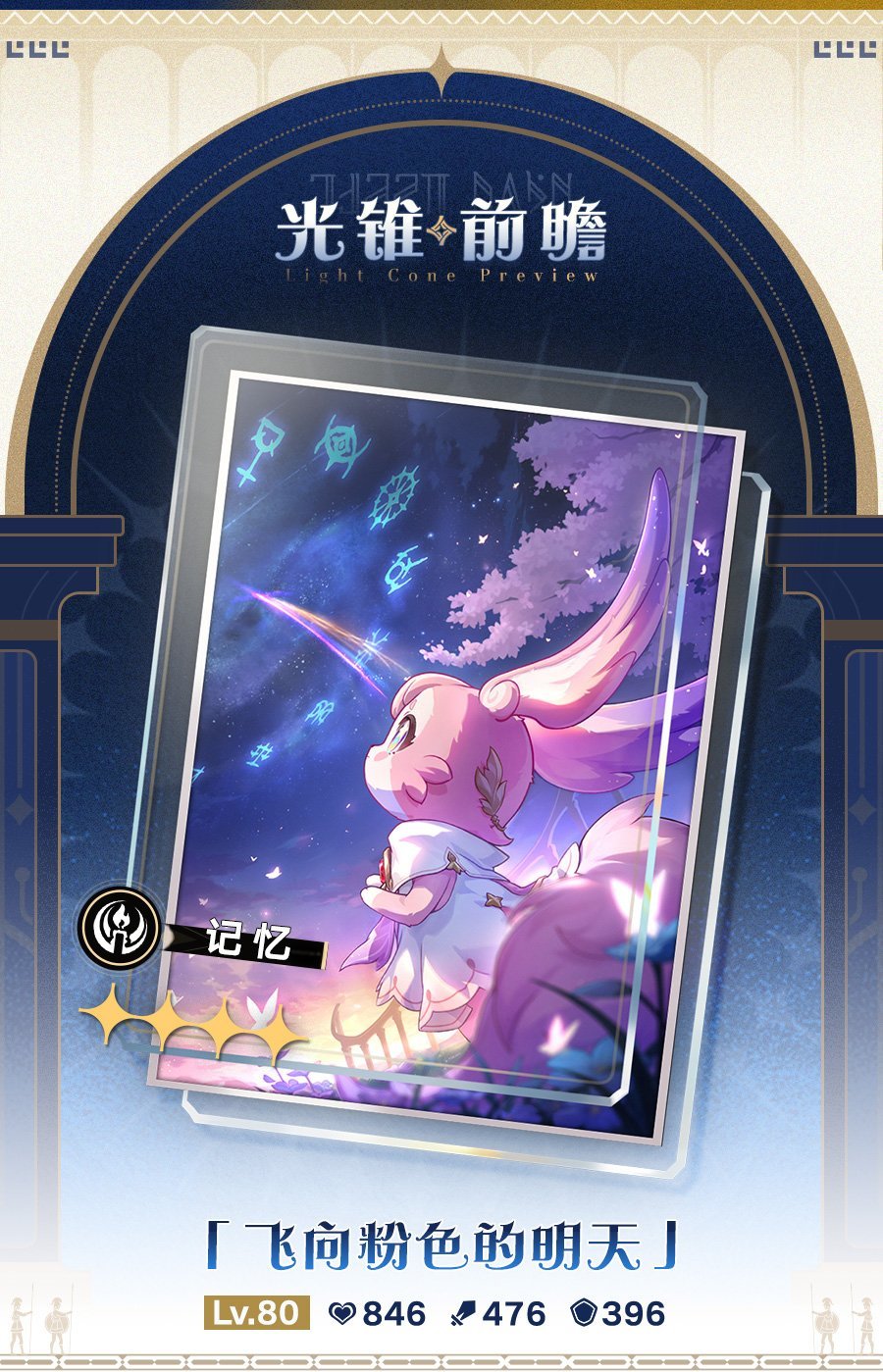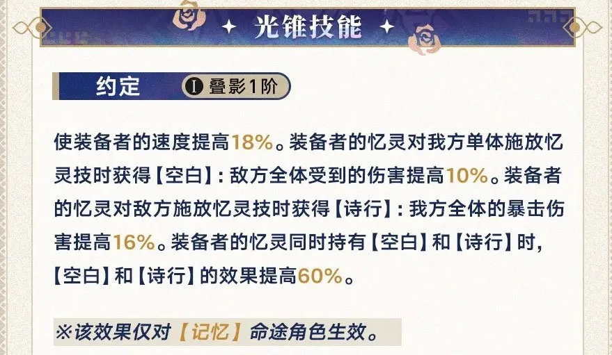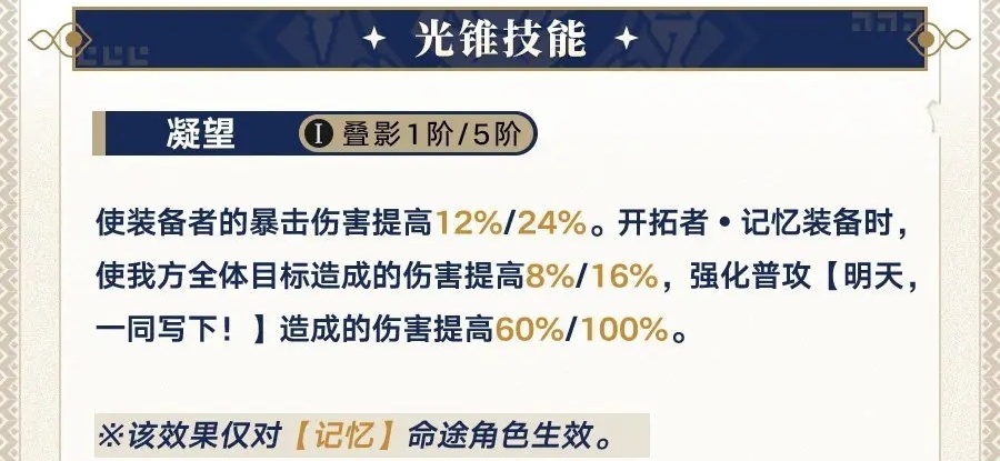 使裝備者的暴擊傷害提高12%/24%。開拓者·記憶裝備時,使我方全體目標造成的傷害提高8%/16%,強化普攻【明天,一同寫下!】造成的傷害提高60%/100%。