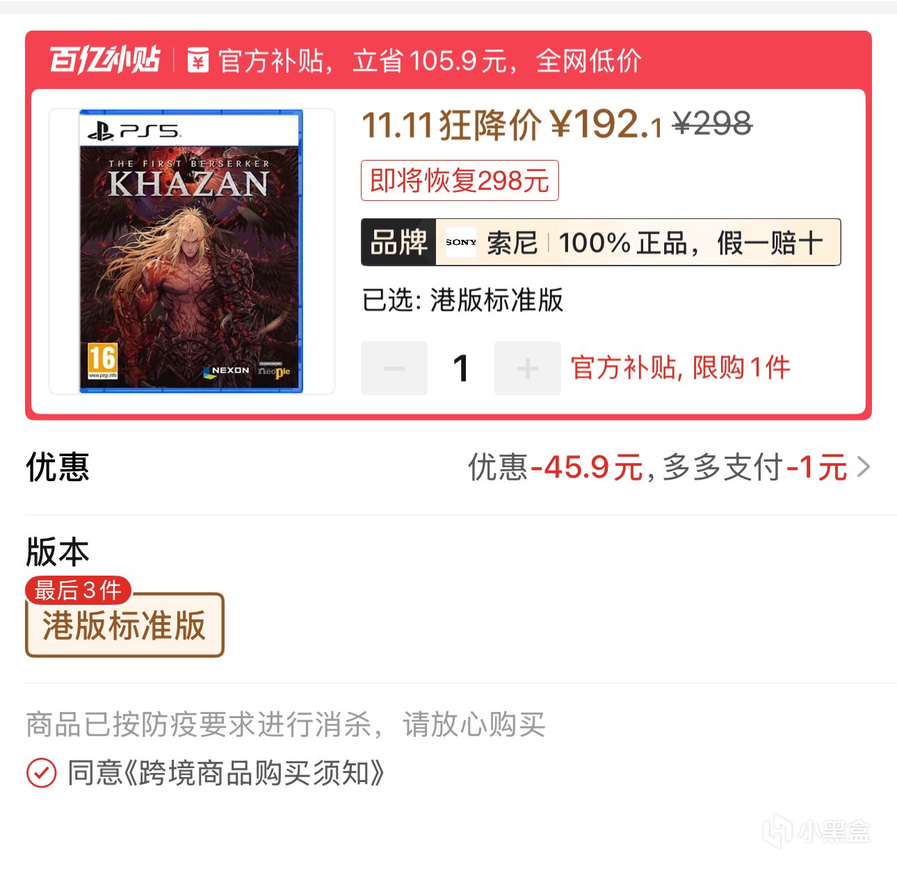 1.PS5游戏《第一狂战士:卡赞》港版中文192.1元全新包邮