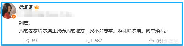 10 月 29 日徐冬冬直接在社交媒体给这场争议画上句号,明确说吵架的事已经翻篇,婚礼肯定要在老家哈尔滨办,而且是场简单的仪式。
