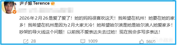到了当天午间,尹子维才解释清楚来龙去脉。原来争执全因婚礼地点,2 月 26 日这个日子谐音 “爱了爱了”,徐冬冬妈妈很喜欢,但他觉得杭州更合适,毕竟 2 月的哈尔滨天太冷,怕宾客受罪。可徐冬冬是哈尔滨人,坚持要在家乡办,这份乡情成了吵架的导火线。