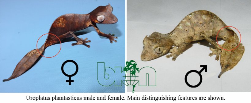 具有性别二态性(两性异形),雄性通常有一条类似于破烂叶子的尾巴,而雌性通常有一条类似于新鲜叶子的尾巴。相比之下,更为显眼的雌性则更容易被天敌捕食。
