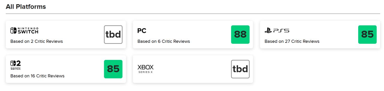 截至发稿前,Metacritic 收录 27 家媒体(PS5),均分 85 分。其中 25 个好评,2个中评,0个差评。