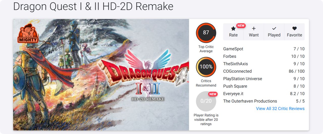 OpenCritic 收录 32 家媒体,均分为 87 分,推荐率 100 %。