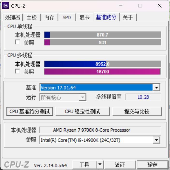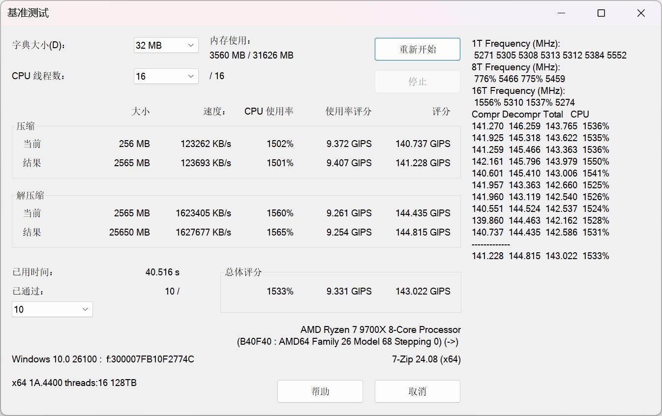 生产力方面,7-zip基准测试143 GIPS也是非常高了,我的9700X第一次跑到这么高。